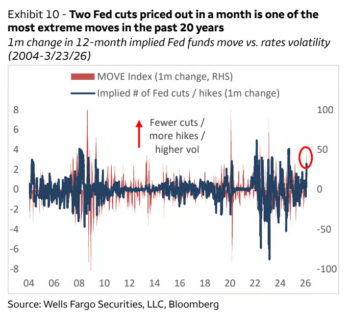 Even Goldman Sachs cannot predict the exact path and movement of a security or asset class. The market has seen one of the largest shifts in Fed rate expectations in the last twenty years. The market has completely priced out two Fed rate cuts that were a given just over a month ago and is now pricing in at least one rate hike in 2026. This has caused the yield on the 2-year Treasury to rise 62 basis points since the Iranian conflict started. This is based solely on the price of oil having risen 39% over the past few weeks and the prospect of a prolonged conflict that could spell even higher oil prices for an extended period of time. A rise in inflation due to high gas prices for the consumer is the reason for the change from expected Fed rate cuts to rate hikes. However, if the 4 to 6 week