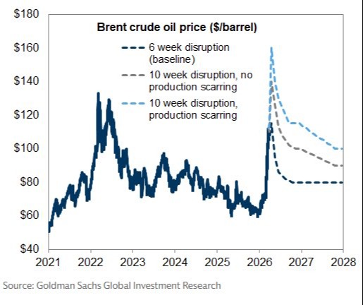 The timing and exact outcome of the current conflict in the Middle East is ultimately unknown. Those that say they know where equities are headed or where oil is headed are guessing at best. Iran had stated publicly for years that they were only capable of firing missiles 1,240 miles, but just 9 days ago, fired missiles with a range of at least 2,500 miles. When Iran has said they were not willing to negotiate, Pakistan, Oman, & Qatar publicly stated they were serving as mediators between the U.S. and Iran. Saudi Arabia, Turkey, & Egypt are discussing assisting ships in the Strait of Hormuz. In Iran, President Pezeshkian has clashed with the IRGC and believes continued tensions with the U.S. could cripple Iran. With all this as a background, Goldman Sachs has published their scenarios for a 6-week and 10-week oil disruption. While these are only scenarios, the laughable part is the symmetrical dotted lines resulting from the projections.