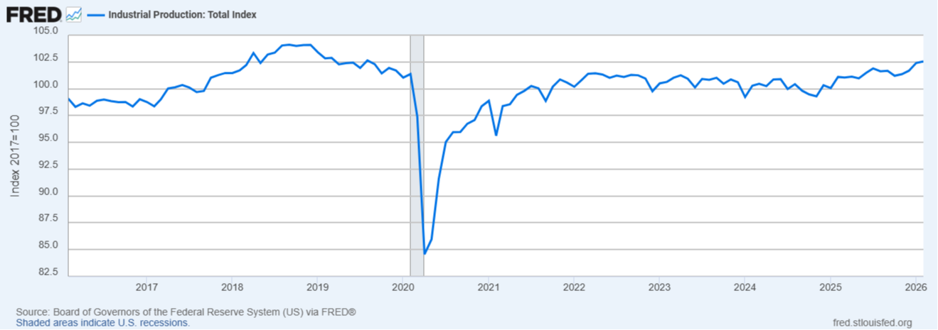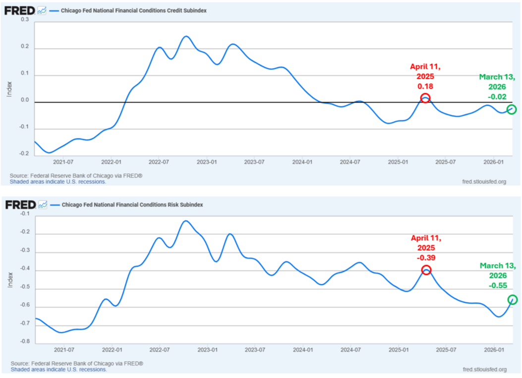 shown the typical signs of an imminent recession. The two subindices of the Chicago National Financial Conditions Index - Credit and Risk - tend to pinpoint more volatile areas of the economy and usually trigger earlier warning signs than the broader index. Currently, both subindices remain below zero, meaning conditions are loose, and are below the levels seen during Liberation Day last year. By the peak of the tariff-related pullback last year on April 11th, the Credit subindex had risen to 0.18 and the Risk subindex had risen to -0.39. The current level of the Credit