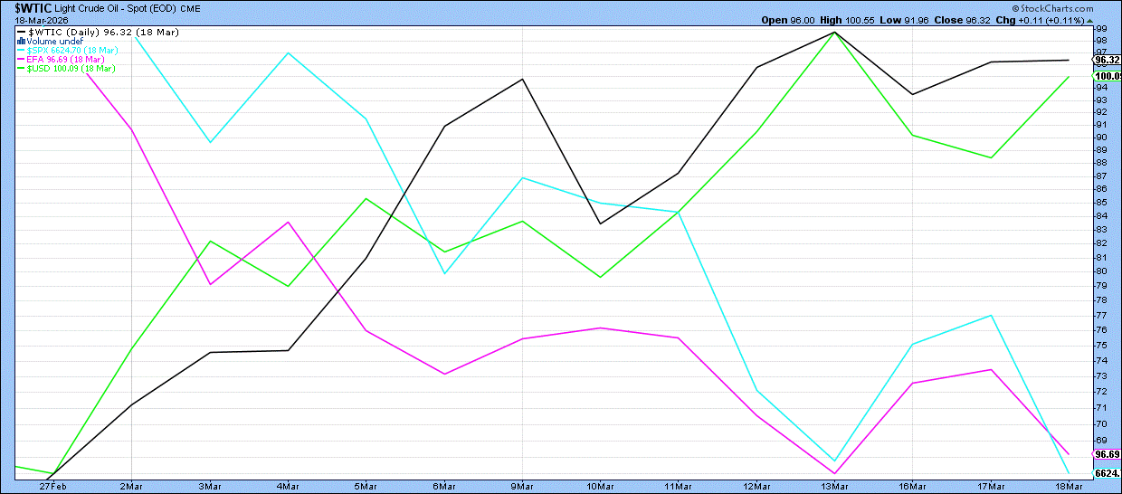 resolution in the conflict, it will take some time - maybe months - for oil inventories to adjust. Meanwhile, we are seeing the "risk-off" trade playing out in real time as the movement in risk-off assets (oil and US dollars) and risk-on assets (domestic and and international equities) remaining contrary. With every headline involving the Iran conflict and oil, equities move lower. However, taking any considerable bets on oil and/or the dollar out-performing over the long-term could be hasty. This week, there has been a turnaround for allies - Japan, Britain, France, Germany, Italy, and the Netherlands - doing a 180 and agreeing to help secure ships navigating the Strait of Hormuz. In addition, the White House has called for Iranian oil already at sea to be "unsanctioned" and free to use on global markets for the 10-14 days worth of supply. Lastly, the President has strongly condemned strikes by Israel on the Pars gas field in Iran, sending a message that escalation is not in the cards for the U.S. military. These revelations have caused oil to trade lower this week. Who knows - the next news item could push oil back above $100/barrel. Placing significant bets on the news item of the day could do more harm to portfolios than good.