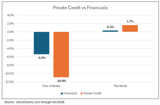 same trading period, with some names up more than 5%. Along with those names, the financial sector is trading positive this week for the first time in 4 weeks. And, just when things are looking a little better for private credit, the prevailing minds in the financial community - Goldman Sachs and J.P. Morgan to name a couple - have decided in their infinite wisdom to introduce shorting instruments into the market that would allow investors to bet against a recovery in private credit. So, a market segment that is already suffering to distinguish signals from the noise is now subject to investors who will find it difficult to differentiate among true private credit firms/funds in this space. One can only hope that these instruments fail to gain much traction or redemptions will pail in comparison to investors getting in line to short the same names.