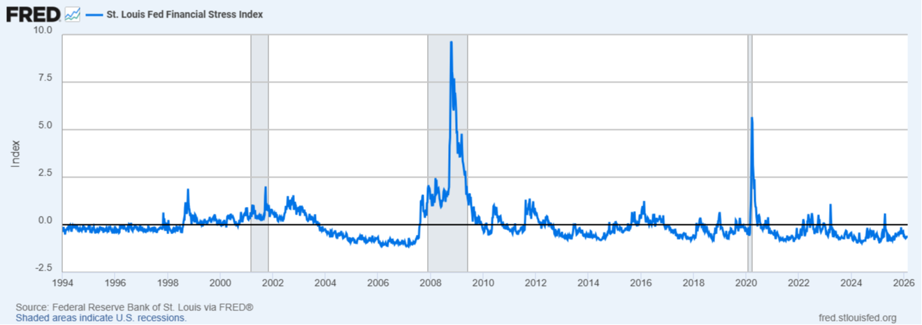 The S&P 500 Index was down -0.76% for the month of February which falls in-line with the average return for February. Equities are also falling in-line with the typical mid-term election year. The S&P 500 has closed within 2.5% of its 50-day moving average for 63 consecutive sessions - it's longest streak since 2018. This means buyers and sellers are evenly matched - indecision. If we look under the hood, Mag 7 stocks are down for the year, while the other 493 names in the S&P 500 are up. While Mag 7 drove returns in 2025, that group is down more than 5% so far this year, while some of its competitors in other asset classes - Mid-caps, Small Caps, & International equity - are up more than 9% so far this year. Despite concerns, economic fundamentals remain strong. Both Jobless Claims and Continuing Claims were lower this week and remain at low levels compared to other pre-recessionary periods. Consumer spending, as measured by the Redbook Sales, continue to show a resilient consumer overall. The St. Louis Fed's Financial Stress Index remains below zero and shows a financial system not exhibiting the typical signs of an impending recession. Manufacturing is showing signs of recovery, as manufacturing production has improved over the last 16 months and has reached a new 3-year high. In addition, the regional Fed manufacturing indices, with the exception of Richmond, are all on the mend have improved since hitting lows last year. The best course of action right now is to limit concentrations and remain diversified.