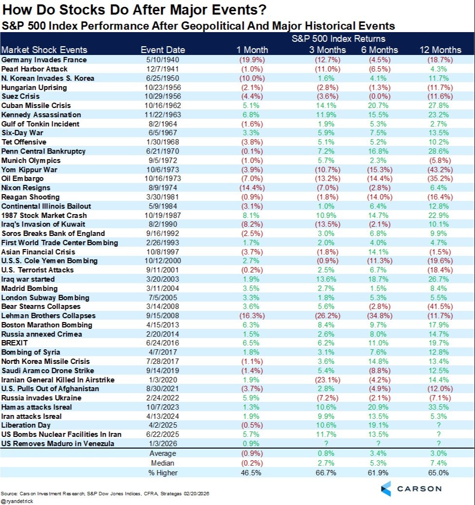 "war risk" policies and are likely raising premiums by up to 50%. This will prevent ships from travelling through the region regardless of Iranian tensions. There are some overtures by the White House that an "off ramp" may be possible should Iran agree to certain conditions - most notably, regime change. Regardless, the average recovery for equities following a geopolitical shock is 30 days to get back to even. What's more, markets are higher 3 mths, 6 mths, and 9 mths after geopolitical shocks at least 61% of the time. In respite from the geopolitical environment, equity markets finished the month on par with seasonality for the month of February.