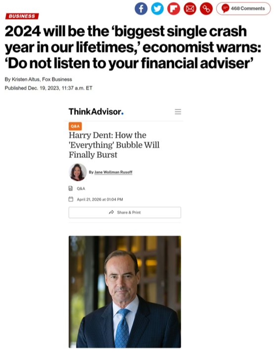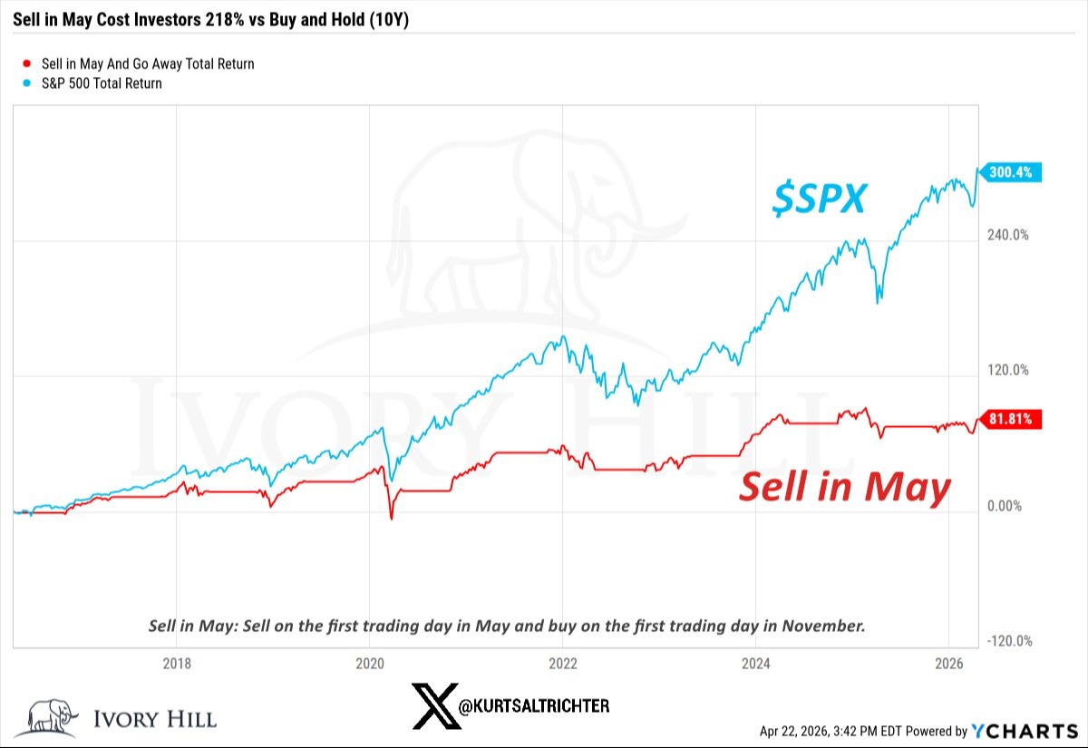 a little more homework. The period of April 1994 to March 2000 was a bull market that lasted nearly 6 years and saw the S&P 500 gain more than 245%. So far, this current bull market started in October 2022 and is only 3.5 years old with a return on the S&P 500 of 98%. Regardless of comparisons, the point is that making wholesale statements about crashes and bubbles is a little irresponsible as no one can predict market outcomes accurately. But, even a broken clock is correct twice a day. Other market pundits have already started spouting the "Sell In May, And Go Away" line that gets repeated around this time in the calendar year. However, it has been shown time and again that this market belief is nothing more than a nursery rhyme. If investors followed this flawed advice 10 years ago and sold on the first trading day in May, only to re-enter the market on the first trading day in November each year, an opportunity loss of more than 200% return would have been realized versus just staying invested. Most studies have shown that the "Sell In May" philosophy actually worked less than half the time. Unlike the advice of Mr. Dent, investors should follow the advice of a trusted financial advisor to avoid getting sucked in by the market's version of an "old wives' tale." P.S. - it's a little ironic that Mr. Dent's latest comments appeared in "ThinkAdvisor" given his penchant for instructing investors to ignore their financial advisors.