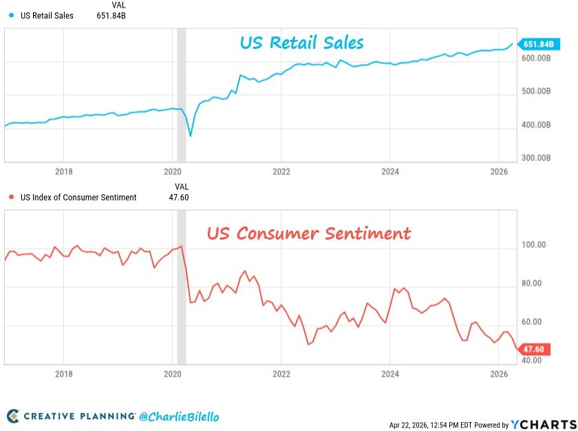 figure out what happened. She lets him know she doesn't want to spend her life with a "wedding singer." To which he responds, "Once again, things that could have been brought to my attention YESTERDAY!" Perhaps that's how investors feel when questioning this rally off the March bottom. However, the information was right under their noses all along. First, though consumers have been downplaying sentiment and stating in surveys about how bad they feel, they continue to exhibit robust spending habits. Consumer spending still makes up nearly