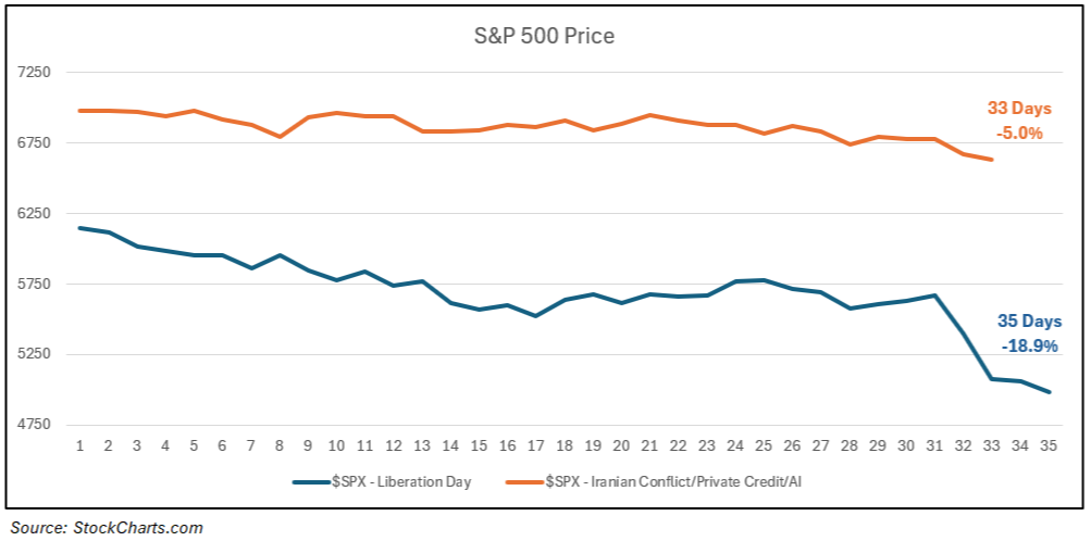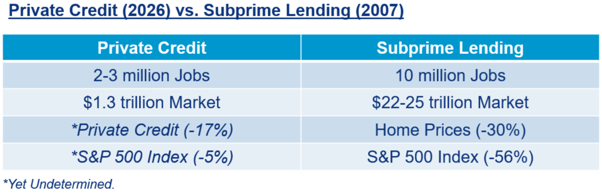 and government bonds have not moved higher as in prior recessionary periods. In fact, spreads haven't even moved as high as last year's response to Liberation Day, which saw spreads rise 74%. Private Credit issues have caused some to compare the current situation to Subprime Lending that led to the 2008 Financial Crisis. However, a brief analysis could help put the two situations in perspective. During the Subprime Lending crisis, the real estate market was the primary culprit, which involved more than 10 million jobs between construction, mortgage lending, and financing. In fact, more than 5.9 million jobs were lost in the 2008 Financial Crisis. It is estimated that only 2 million to 3 million jobs are represented by the current private credit industry. To further contrast the situation, the real estate market in 2007 was a $22-25 trillion market. Most estimates put the U.S. private credit market value at around $1.3 trillion. Finally, the 2008 Financial Crisis saw both equities and home prices decline by at least 30% or more. So far, we have not seen losses in private credit bleed over to that degree in equities. Markets appear to be applauding the coalition in the Strait of Hormuz this morning as oil futures are muted and equities are higher. Expect more volatility in markets until a ceasefire can be achieved.