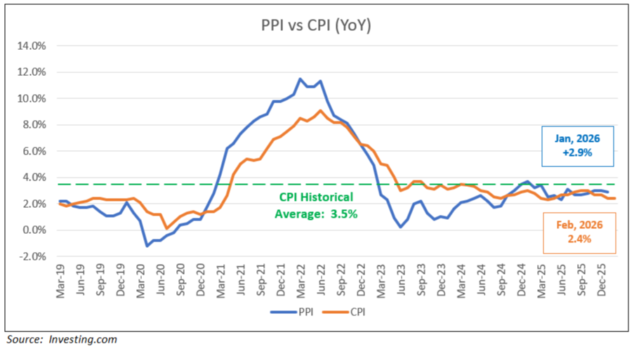 Israel carried out more strikes against Iran. After market hours on Friday, the U.S. hit Kharg Island, a key oil production & export hub for Iran. No immediate ceasefire talks were signaled on Saturday as President Trump suggested more strikes on Iran if ships traveling through the Strait of Hormuz were threatened. Finally, yesterday the White House signaled a coalition of countries would secure the Strait from further disruptions. It's helpful to keep in mind that with spike in oil, equity markets have suffered less downside (-5%), so far, than the decline following Liberation Day last year (-19%). Some positive news last week came from the economic data.