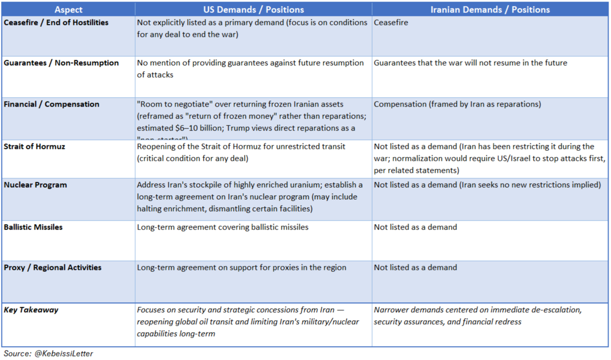 missile sites in Iran over the weekend, new revelations of some kind of ceasefire talks have emerged. U.S. officials let it leak over the weekend that there were conditions being discussed (see table) to bring the conflict to a conclusion. Then, suddenly this morning, the President announced that the US and Iran have had productive discussions over the past 2 days and that he was postponing any new military strikes on Iranian key infrastructure for a five-day period.